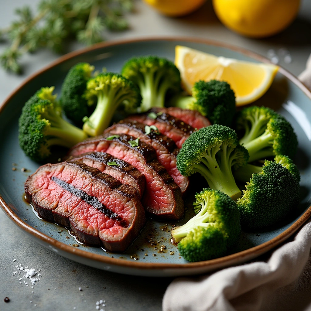 Tender strips of marinated beef grilled to perfection and served alongside crisp, vibrant broccoli for a quick and flavourful Mediterranean-inspired meal.