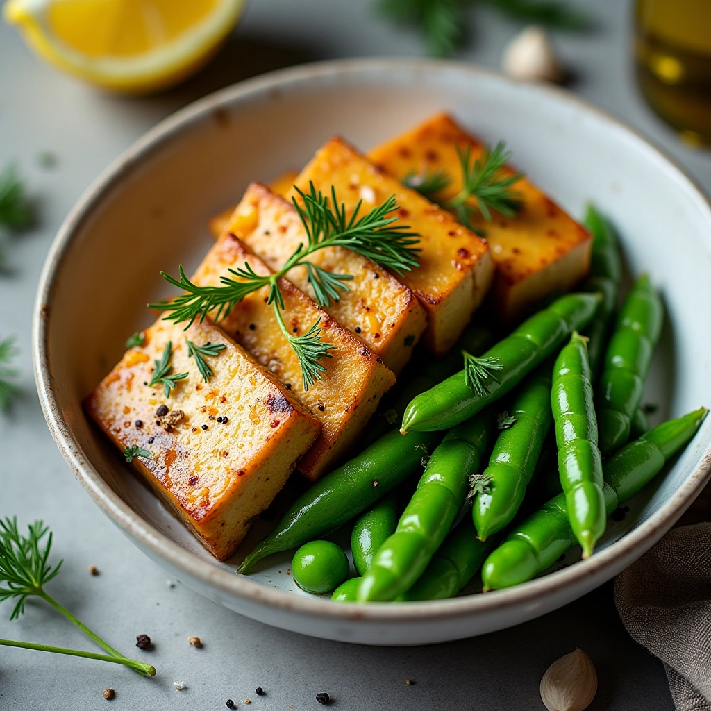 A simple and flavourful vegan main course featuring baked tofu seasoned with fresh herbs, served alongside sweet garden peas.