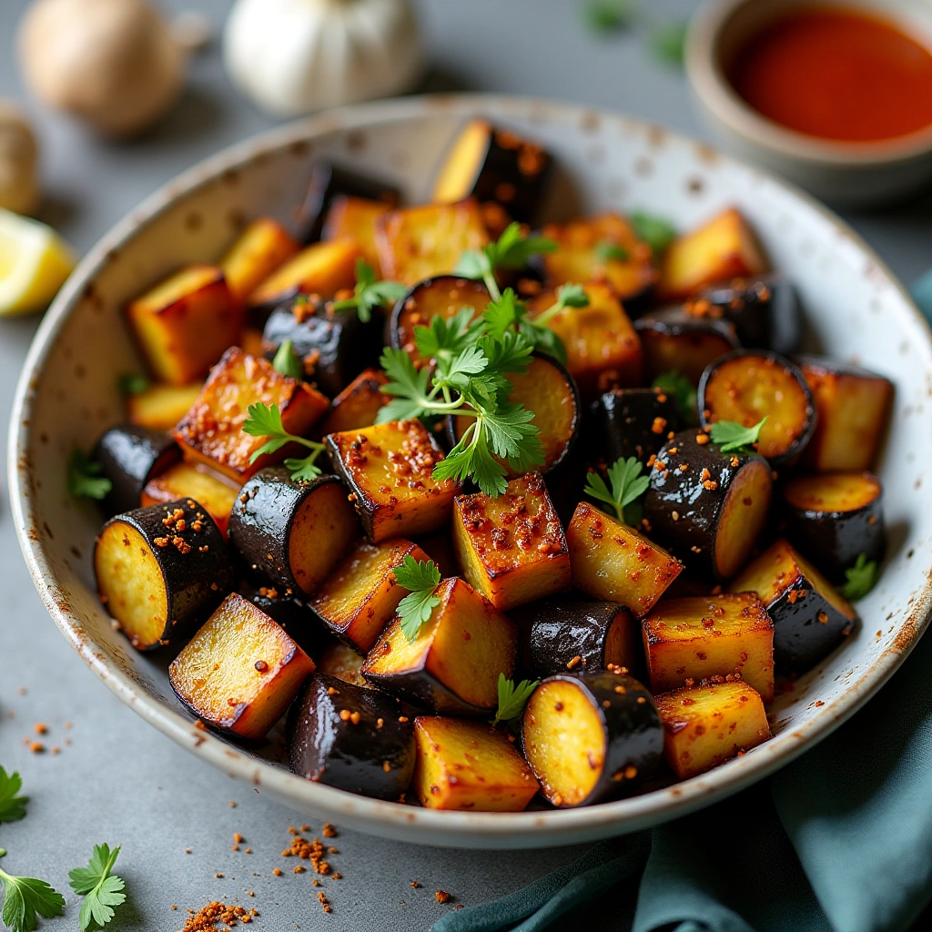 Tender roasted aubergine cubes tossed with warming Indian spices, garlic, ginger, and a kick of chilli for a flavourful vegan side dish.