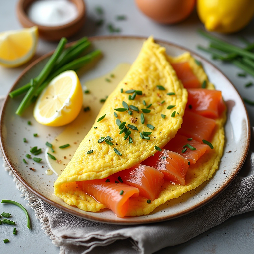 A quick and elegant omelette filled with flaked smoked salmon and fresh chives, perfect for a leisurely breakfast or brunch.